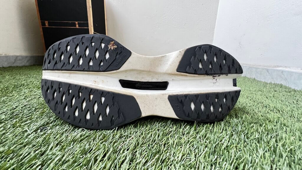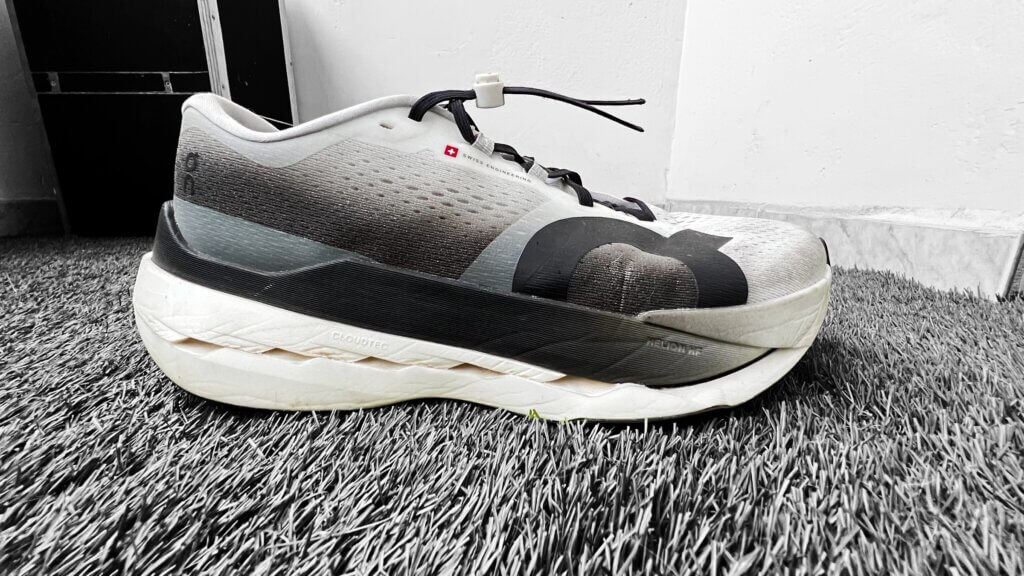 Mesmo a entressola tendo dupla densidade de espuma que é o Helion HF Pebax acima da placa de fibra de vidro que o tênis tem, e o Helion HF Tpee, abaixo da placa.